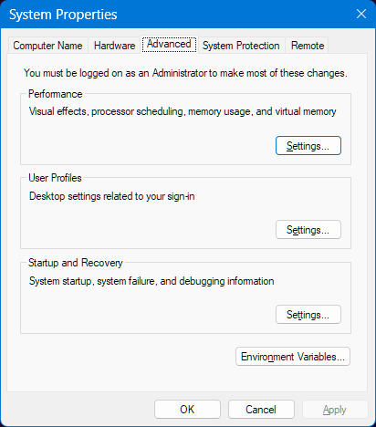 To open Advanced System Settings in Windows Type SystemPropertiesAdvanced